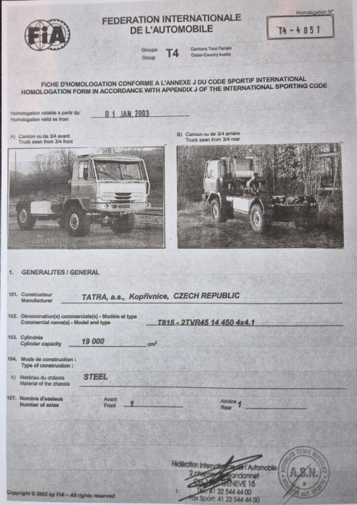 Federace automobilového sportu (FIA) připravila již v průběhu roku 2000 nové technické předpisy kategorie závodních kamionů pro cross-country soutěže, označené jako T4, které měly nabýt platnosti od 1. ledna 2002. Nový předpis mj. nově definoval pojem sériovosti (min. 10 ks identických vozidel za rok), polohu motoru (konec setrvačníkové skříně max. 1000 mm od osy přední nápravy), minimální rozměry nástavby a její tvar (výška musela být alespoň 1650 mm, a nebo stejná jako výška střechy kabiny, a to v délce min. čtyři metry od osy přední nápravy) a některé další. Nový předpis umožňoval start původně homologovaných vozidel až do vypršení jejich homologace na závodech FIA v kategorii „Prototyp“ se samostatnou klasifikací. Nově definovanému předpisu nevyhovovala ani „Puma“, ani Tomečkův „Hasičák“, ale ani vozy Kamaz. Protože však „Puma“ měla homologaci platnou až do roku 2003, tak se předpokládalo její nasazení i v rallye Dakar 2002.